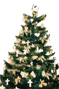 A Chrismon Christmas tree is traditionally adorned with Chrismon ornaments, white lights, and gold balls or garland. All Chrismon ornaments are white, or white and gold. White represents God's holiness, and gold symbolizes the glory of God.