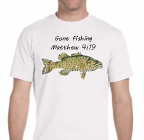 Place wax paper or several sheets of newspaper on the inside body of t-shirt. Place the fish on a sturdy cork bulletin board. Stretch open the fins and pin them to the corkboard using straight pins. Have children take turns lightly painting the fish with fabric paint. Place the t-shirt on top of the painted fish and press lightly, then lift off and allow to dry. Using fabric marker or Scribbles paint write, "Gone Fishing" above the fish, and "Matthew 4:19" below the fish.