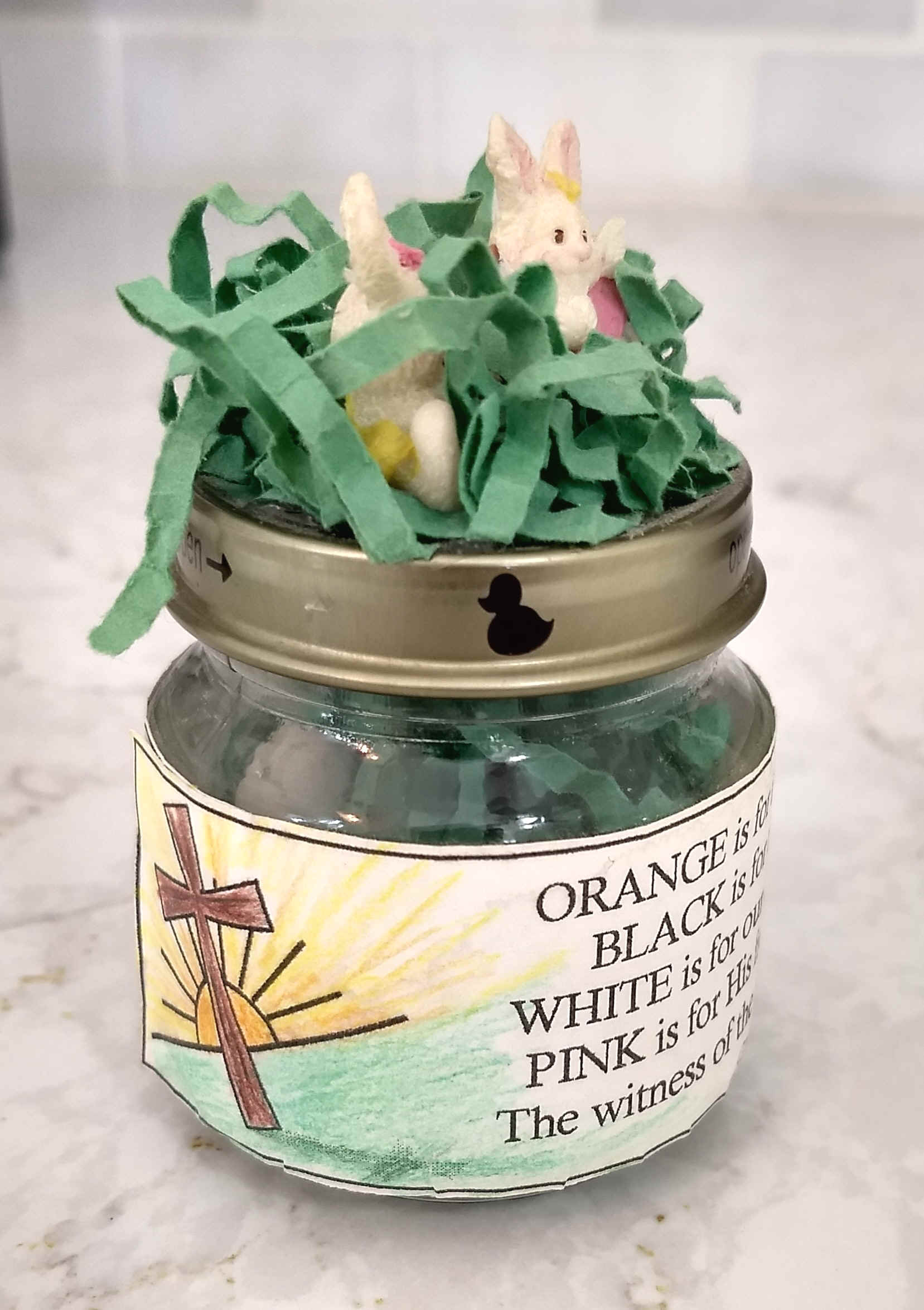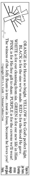 Directions: Print out the special Color's of Christ poem. Color and cut it out, then glue it onto an empty baby food jar. Fill with jelly beans. Decorate the lid with Easter grass, and glue miniature Easter ornaments