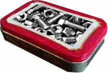 You will need an empty tin (such as an AltoidŽ container), photocopy of nuts and screws (find on internet images), scissors, glue, permanent marker, actual nuts and screws equal to the number of people in your family, and the gift to be included such as a gift card to dad's favorite store, or a "coupon" that can redeemed for a car wash, yard raked, weeds pulled, etc. by the child.