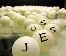 Write one letter from the phrase "Jesus Saves" on each of the team's Ping-Pong balls (one letter per ball). Team lines stand shoulder to shoulder, approximately two feet apart. Team lines stand parallel to one another. Place the box of balls at one end of each team line.