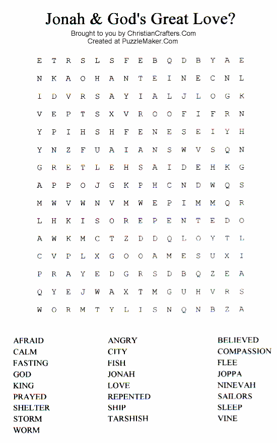 Make sure you've read through the book of Jonah before working the puzzle, then find the keywords in the puzzle, which are from the book of Jonah. When everyone has solved the puzzle, have them tell you how the keywords fit into the story of Jonah. (For example: one of the keywords is angry. The correct answer is that Jonah was angry with God for saving the Ninevites.)