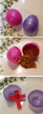 rotten mixture into half of one of the colorful plastic eggs, and then tightly close the egg. Place one of the crosses inside a second plastic egg. You can cut your own crosses from red foam fabric. Make sure the egg colors are different so you can remember which one contains the cross! Keep the two eggs separate from the other eggs in the bag,