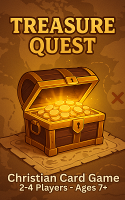 Don't miss our Christian card game -- Treasure Quest! In this exciting, Scripture-based adventure, players collect cards that reflect Kindness, Faith, Forgiveness, Service, and Sacrifice. It's a powerful way to grow godly character while having fun! Be the first to gather all five treasures and win the game -- and a heart set on things that truly matter. Available exclusively on our Etsy platform! Learn more.