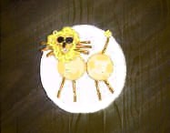 To build the head, "draw" a mane using the cheese in a can. Place a dot of cheese for the eyes, nose, and mouth. Place the raisins